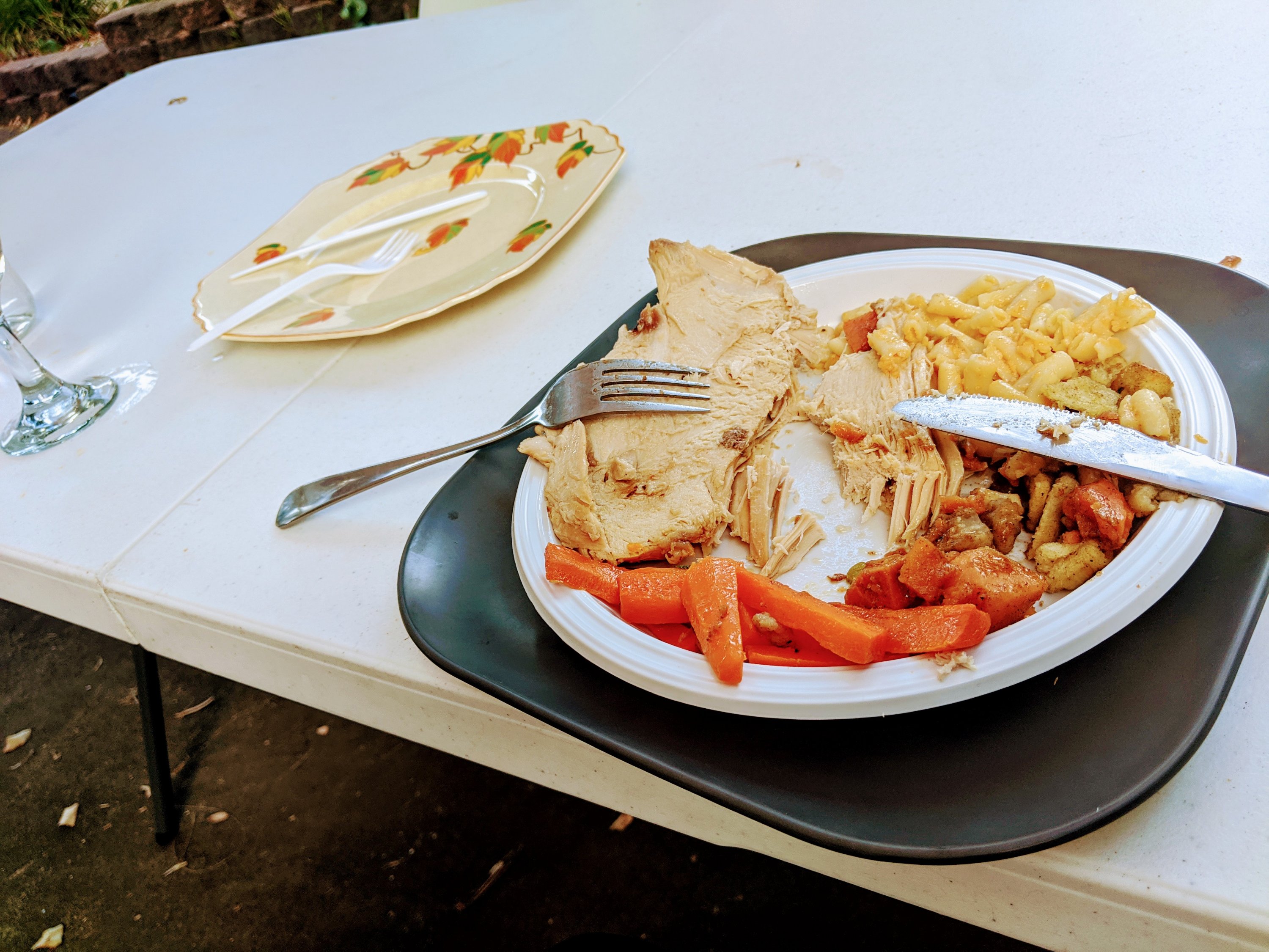The better half of one of my neighbours hails from the land of the rising maple sirup, and so it was that Muggins got to enjoy a Sunday roast again, it being Canadian Independence Day and she was kind enough to share the holiday meal with me. It was so nice to see my neighbour descend the slope down to my backyard carrying a plate of comfy and tasty sustenance.